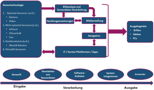 Für Augmented Reality Anwendungen spielen Sensordaten eine zentrale Rolle. Zwar ist bereits eine Vielzahl unterschiedlicher Sensoren auf dem Markt verfügbar. Die Herausforderung besteht jedoch darin, sowohl optische als auch nicht optische Sensordaten miteinander zu verbinden, diese zu verarbeiten und in AR-Ausgabegeräten (AR-Brillen, Tablets, Monitoren) mit entsprechenden Zusatzinformationen darzustellen.